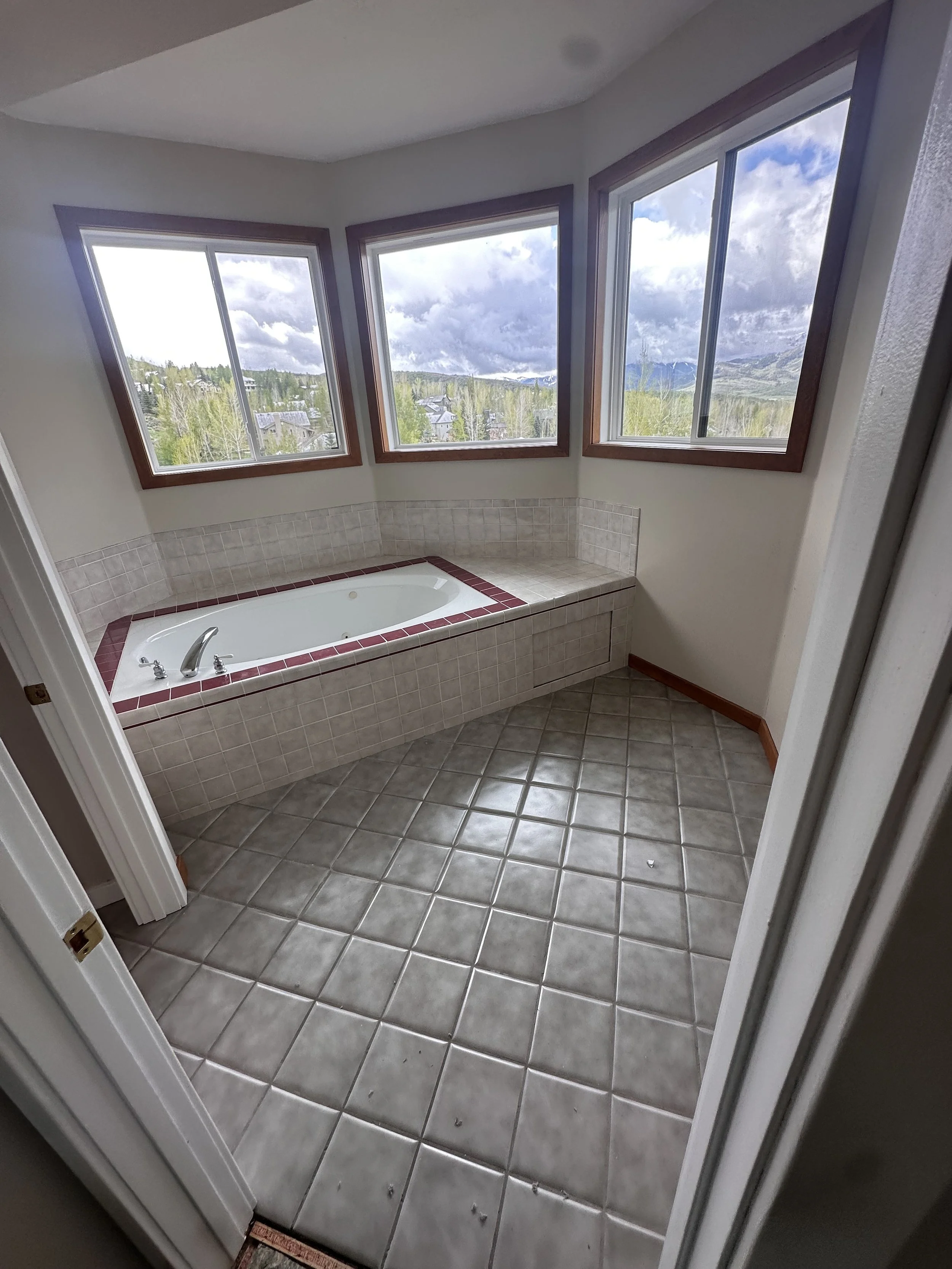 After: Updated with a luxurious soaking tub, dramatic light fixture, and deluxe floor and wall detail.